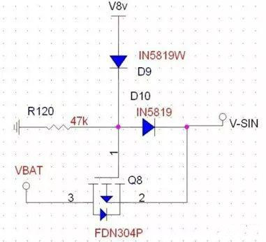 由PMOS来进行电压的选择,当V8V存在时,此时电压全部由V8V提供,将PMOS关闭,VBAT不提供电压给VSIN,而当V8V为低时,VSIN由8V供电。注意R120的接地,该电阻能将栅极电压稳定地拉低,确保PMOS的正常开启,这也是前文所描述的栅极高阻抗所带来的状态隐患。D9和D10的作用在于防止电压的倒灌。D9可以省略。这里要注意到实际上该电路的DS接反,这样由附生二极管导通导致了开关管的功能不能达到,实际应用要注意。