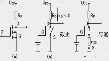 uGS>开启电压UT:MOS管工作在导通区,漏源电流iDS=UDD/(RD+rDS)。其中,rDS为MOS管导通时的漏源电阻。输出电压UDS=UDD·rDS/(RD+rDS),如果rDS《RD,则uDS≈0V,MOS管处于“接通”状态,其等效电路如上图(c)所示。