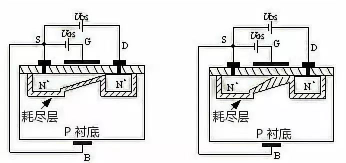 如果在栅极加负电压(即uGS<0=,就会在相对应的衬底表面感应出正电荷,这些正电荷抵消N沟道中的电子,从而在衬底表面产生一个耗尽层,使沟道变窄,沟道电导减小。