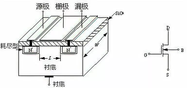 N沟道耗尽型MOSFET的结构与增强型MOSFET结构类似,只有一点不同,就是N沟道耗尽型MOSFET在栅极电压uGS=0时,沟道已经存在。该N沟道是在制造过程中应用离子注入法预先在衬底的表面,在D、S之间制造的,称之为初始沟道。