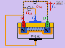 如果进一步提高UGS电压,使UGS达到某一电压UT时,P衬底表面层中空穴全部被排斥和耗尽,而自由电子大量地被吸引到表面层,由量变到质变,使表面层变成了自由电子为多子的N型层,称为“反型层”,MOS管工作原理动画图2—55(b)所示。